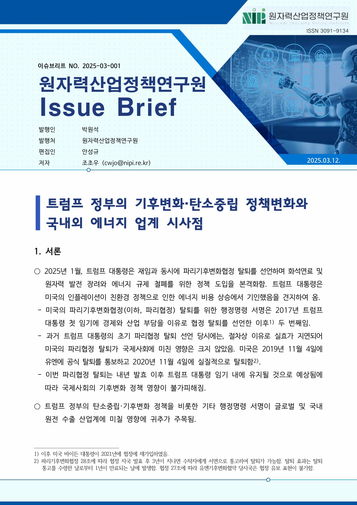 [이슈브리프 NO.2025-03-001] 트럼프 정부의 기후변화, 탄소중립 정책변화와 국내외 에너지 업계 시사점